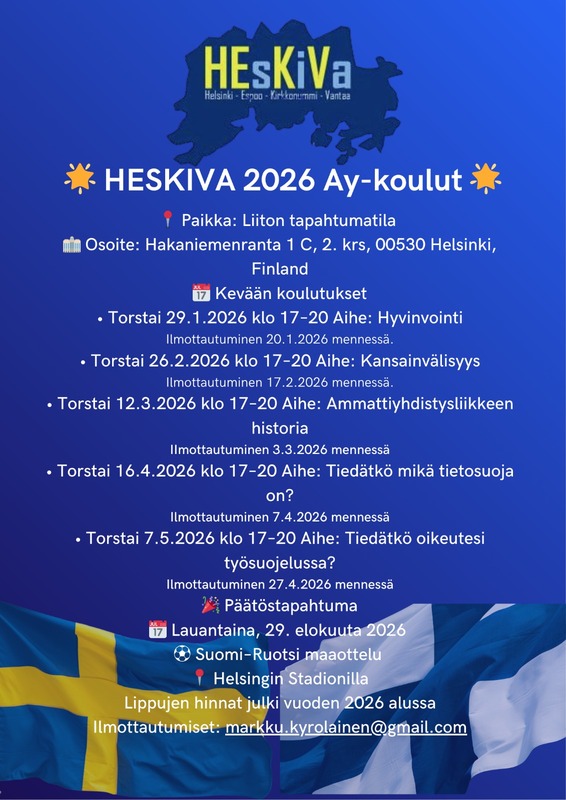 Tässä HEsKiVa koulutukset aikataulut . Tuu mukaan! Jos on kysyttävää laita viestiä Deniz Filippi AO12 puheenjohtaja / koulutus vastaava.